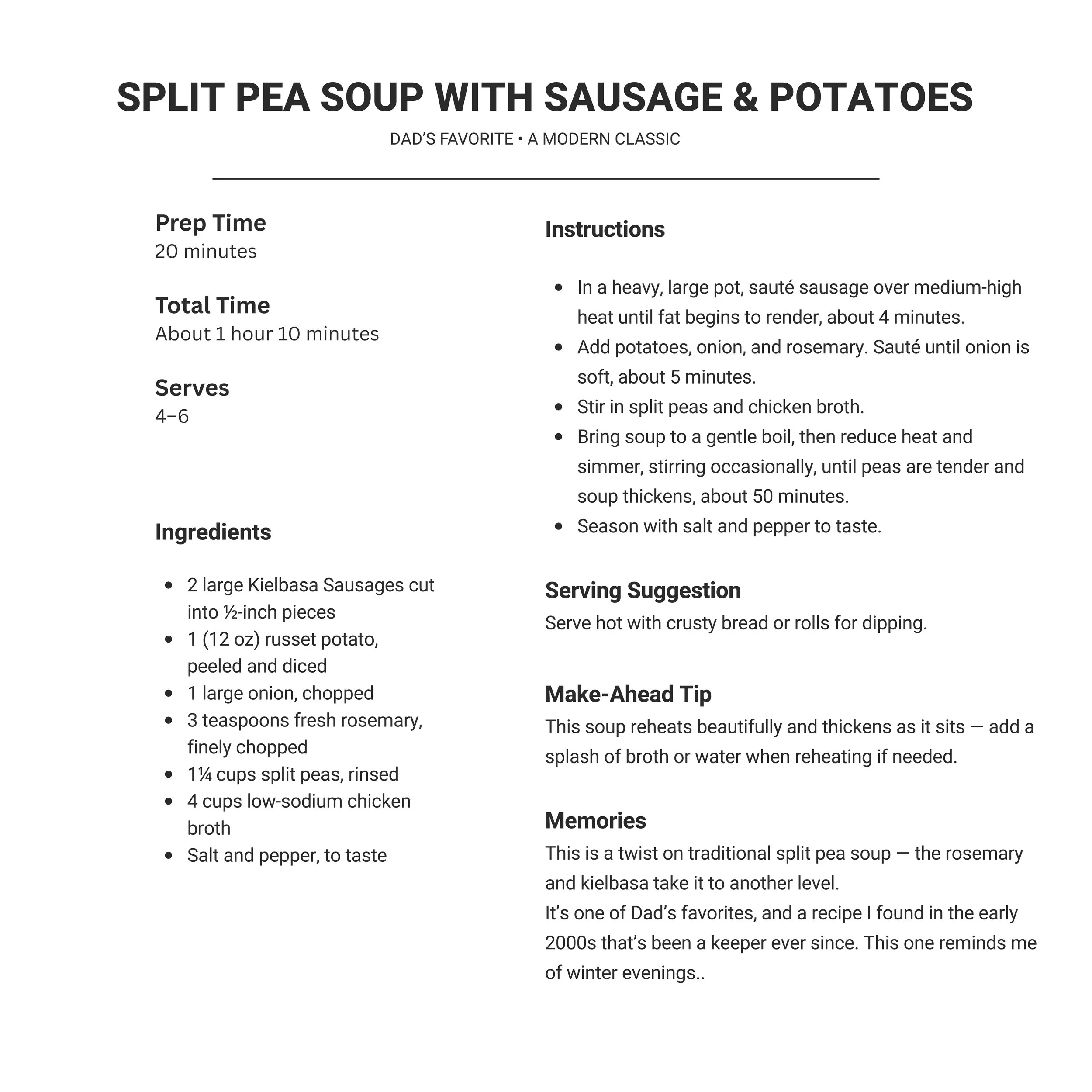 This rosemary split pea soup has been on repeat around here lately. It’s simple, filling, and exactly what I want on cold evenings when the day has been full and all I crave is something steady and familiar. The rosemary adds a quiet depth, and the sausage and potatoes turn it into a true one-pot dinner—the kind that simmers slowly while the house softens around it.