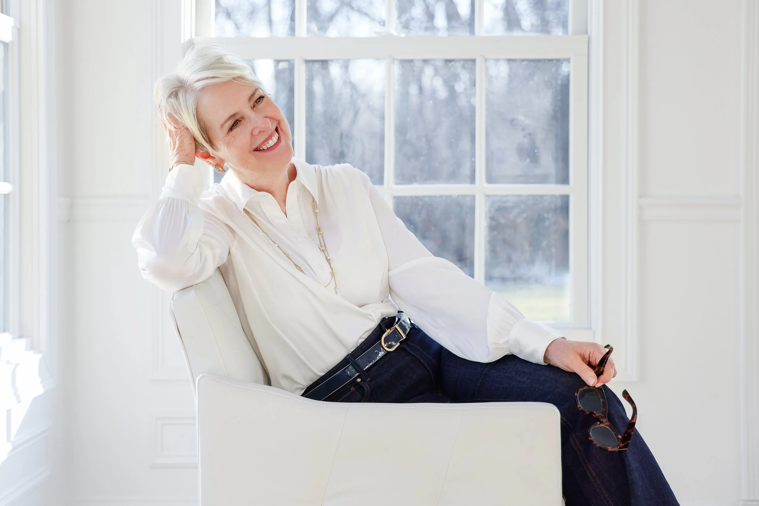If you typically wear glasses, you should bring them to your headshot session. If you wear transitional lenses, those can be a huge issue in the light, so you may want to wear a pair that the lenses have been removed or have your eye doctor remove them temporarily for your shoot. Transition lenses are very difficult to photograph and still see your eyes.